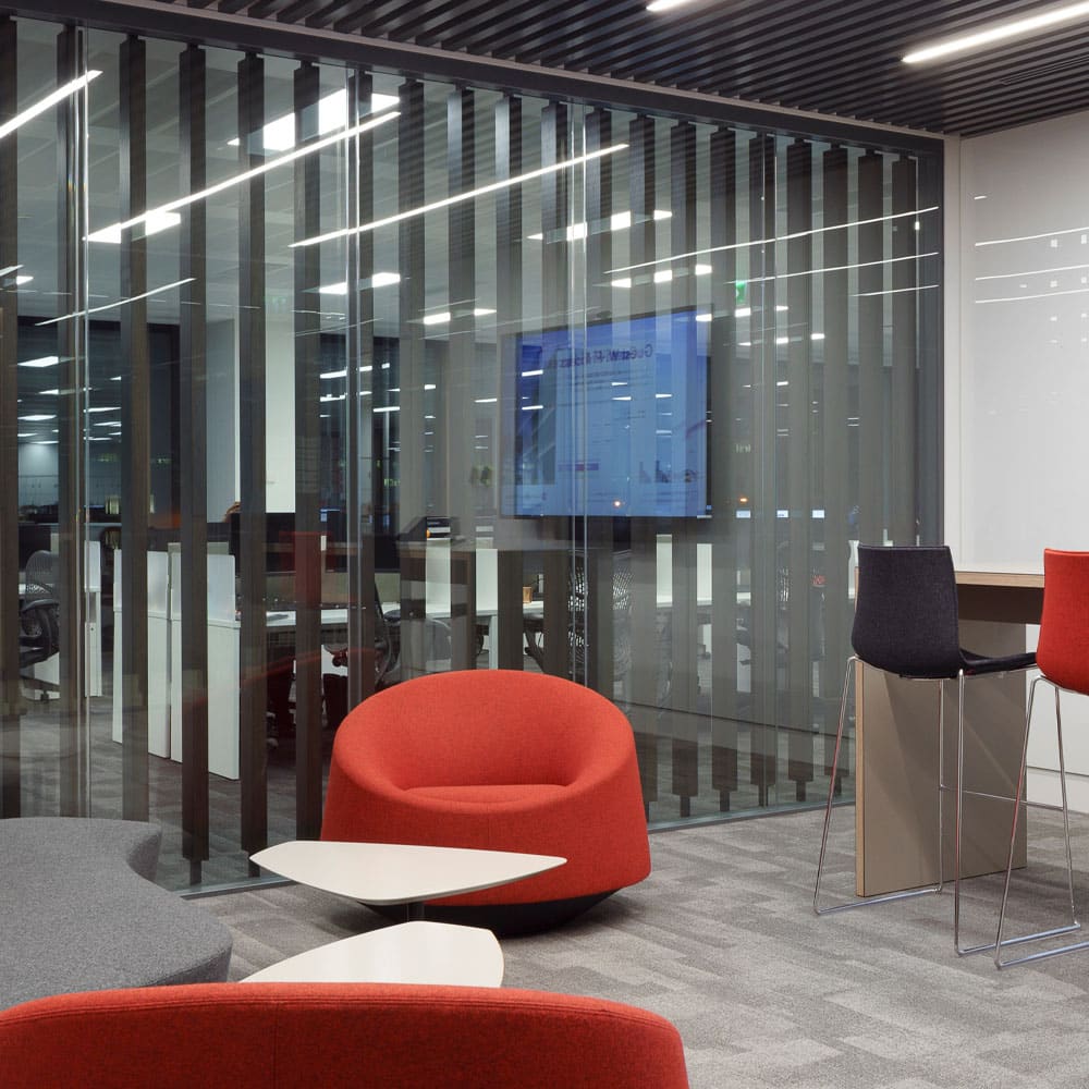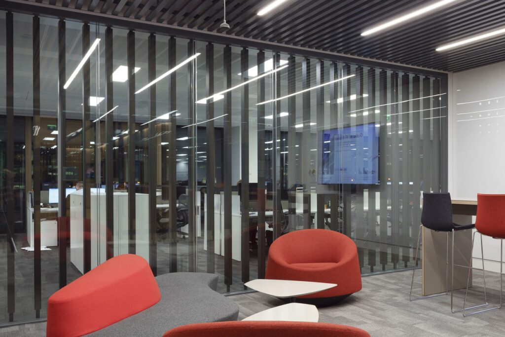 Walls to Workstations was hired as a Sub-Contractor by Bennett Construction to supply and install Optima  Revolution 54 and Revolution 100 double-glazed screens across six floors of Grant Thornton’s building.